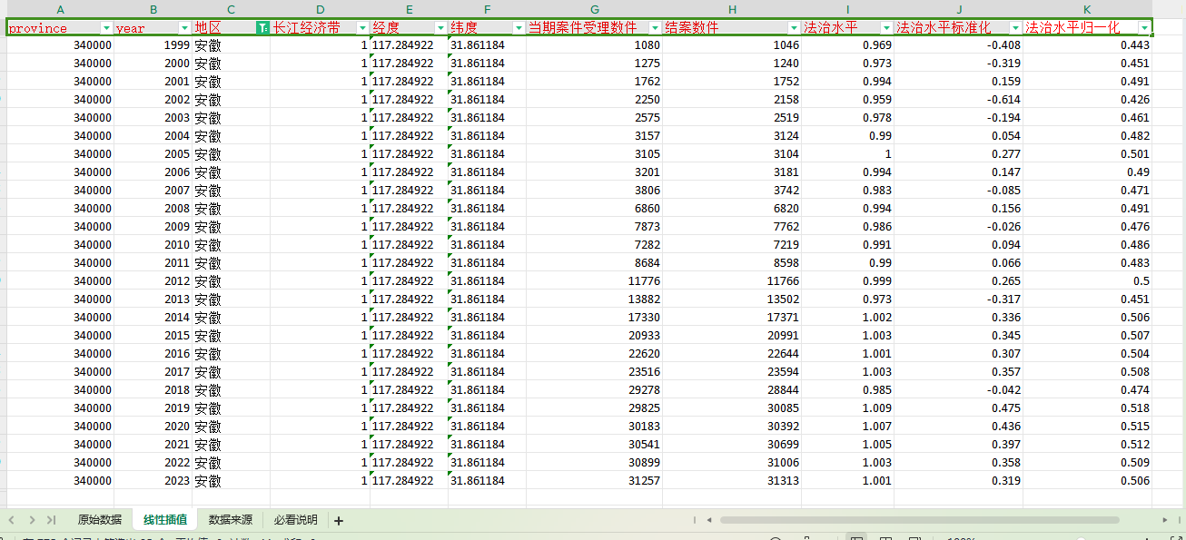 数据名称1999 - 2023年各省份法治水平指数(原始数据、线性插值),其中缺失值及2021 - 2023年的数据是线性补充。