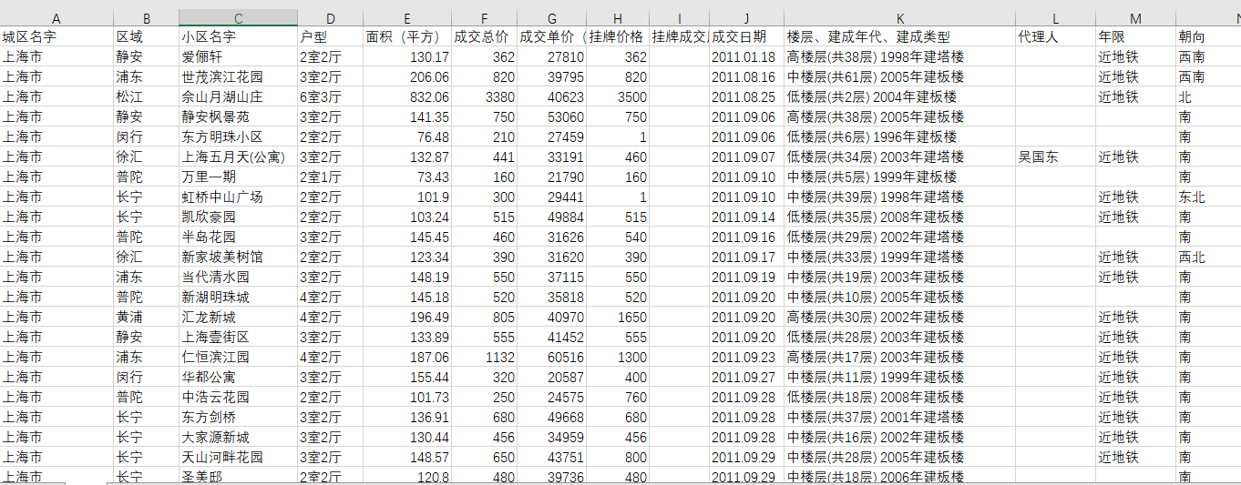 数据表头字段:|城区名字|区域|小区名字|户型|面积(平方)|成交总价(万元)|成交单价(元/平方)|挂牌价格(万元)|挂牌成交周期|成交日期|楼层|建成年代|建成类型|代理人年限|朝向|装修|成交链接|