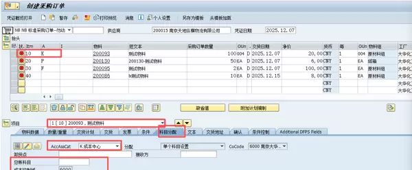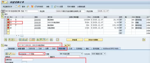 - 创建采购凭证:在创建采购订单时,选择“科目分配”页签,输入相应的科目分配类别(如K-成本中心、A-资产)和对应编码。系统根据后台配置自动推荐总账科目,允许手动调整。