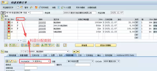 - 消耗型物料:如Z500包装材料,在评估范围6000下,数量和价值更新关闭,采购时必须明确成本归属,因此需选择科目分配类别,页签会强制显示。