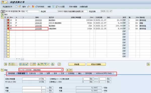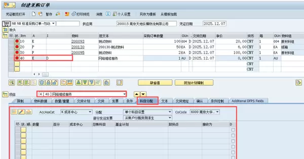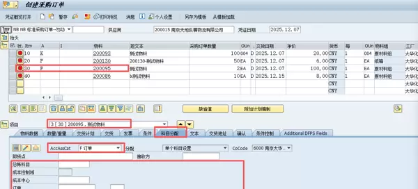 在SAP采购订单中,“科目分配”页签是否显示,并非全局统一设置,而是由行项目的多个字段组合决定,主要包括:科目分配类别、项目类别、物料类型。同一张采购订单的不同行项目可能出现部分显示、部分隐藏的情况,如下图所示。