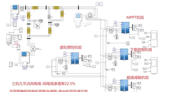针对此问题,在三机九节点系统基础上进行了结构扩展,构建包含四组双馈风电机组的改进型仿真模型,用以模拟实际风电场运行场景。每组风机配置不同的调频策略,实现多模式协调控制。