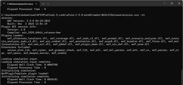 插件DLL已成功加载,文件输出显示在插件初始化函数【WsfPluginTemplate::Initialize()】中打印了【WsfPluginTemplate plugin loaded!】,表明插件正常运行。