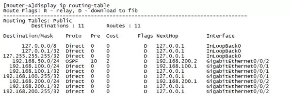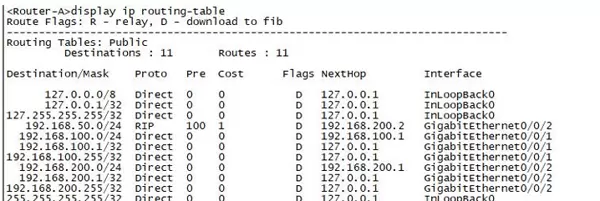 (1)运行 display ip routing-table 查看Router-A的路由表详情(截图);