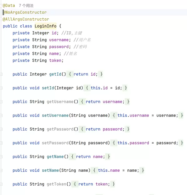 定义LoginInfo实体类,用于封装用户登录后的返回信息,包括用户基本信息及生成的令牌。