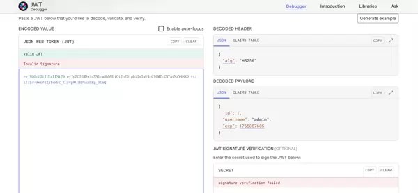 生成后的令牌可在 JWT 官网调试工具中进行解析与验证。