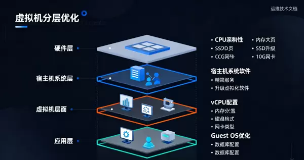 虚拟机性能受多层级因素影响,包括物理硬件、宿主机操作系统、虚拟机自身配置以及内部运行的应用程序。遵循“由底向上”的优化顺序,往往能取得更佳成效。
