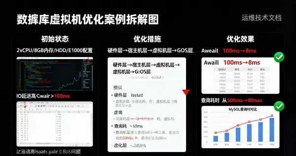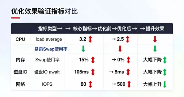 | 磁盘IO | await | 105ms | 8ms | IO延迟降低92%,吞吐量提升3倍 |