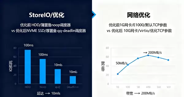 - 硬件层改进:将传统 HDD 替换为 NVMe SSD,大幅提升随机读写性能;同时将网卡更换为 virtio 类型,提升网络效率;
