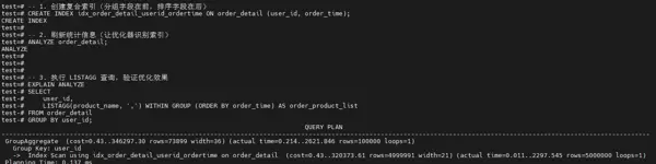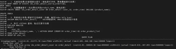 此外,对于 LISTAGG 类型的聚合查询,设计包含“分组字段 + 排序字段 + 聚合字段”的覆盖索引,是实现极致性能的关键。配合定期执行 VACUUM ANALYZE,可确保仅索引扫描(Index Only Scan)生效,无需修改SQL即可达成高性能目标。