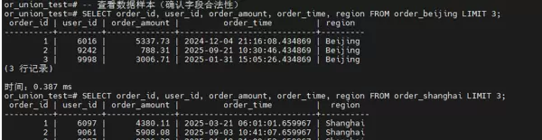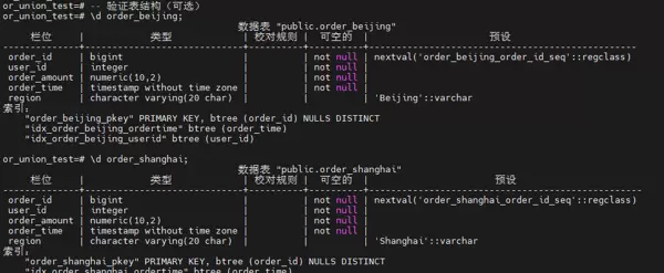 首先验证数据库中 order_beijing 与 order_shanghai 表的结构是否符合预期设计,确保字段类型、主键及初始索引配置正确无误。