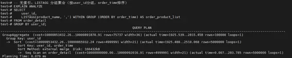 尽管数据访问路径更优,但整体查询时间下降不明显。原因在于LISTAGG需对每个user_id下的product_name进行字符串拼接聚合,该操作本身消耗大量CPU与内存资源。当数据量达500万级时,此类计算开销难以完全规避。