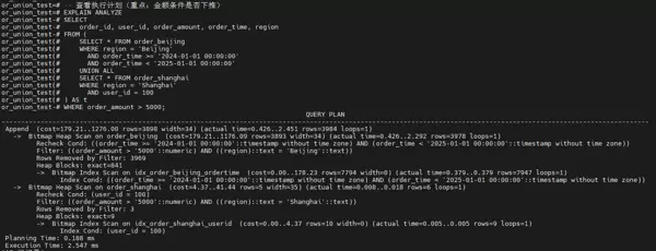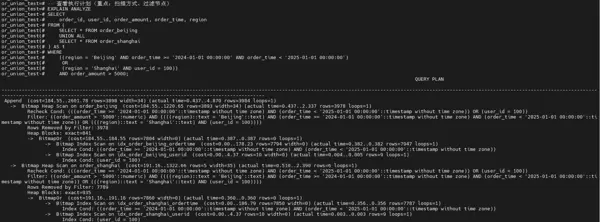 结果表明,执行计划与“条件全下推”完全一致:优化器自动将 order_amount > 5000 条件下推至各自子查询中,北京表和上海表依然使用高效索引路径,实际扫描数据量未增加。