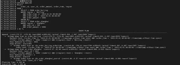 由于 OR 连接的是跨表的不同维度条件(北京的时间 + 上海的用户ID),优化器无法将其分解,只能尝试对两张表同时启用多个索引并通过 BitmapOr 合并结果,造成扫描范围扩大、中间数据膨胀、过滤成本上升。
