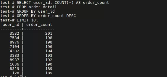 查看前10位高活跃用户,其订单数量应不低于100单。