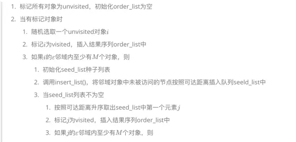 - 最终输出有序点列及其对应的可达距离,形成可达性图,用于分析聚类结构。