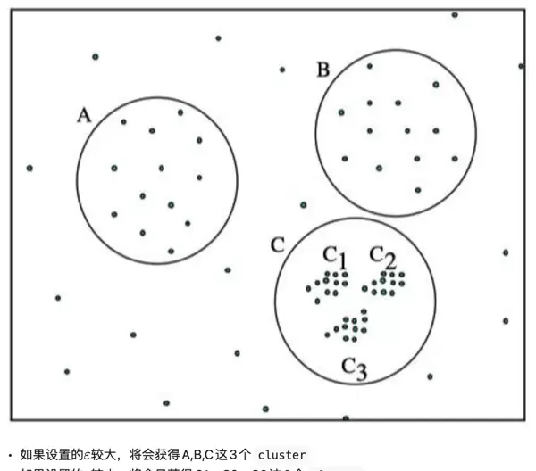 - 边界点:非核心点,但落在某核心点的 \(\epsilon\)-邻域内;