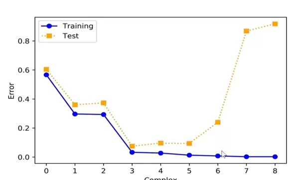 通过以下图表可以更清晰地理解这一现象(横轴表示模型复杂度,纵轴为误差):