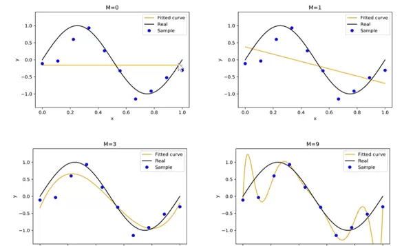 - M=9(九次多项式):虽然精确穿过所有训练样本点,但在区间内出现剧烈震荡,严重偏离真实函数走势,这是典型的过拟合——模型过度记忆噪声而非学习规律。