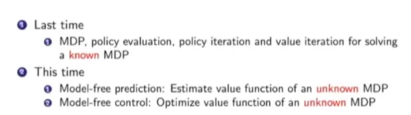 此前课程中,我们已经引入了马尔可夫决策过程(MDP)的基本框架,并讲解了如何在给定某一策略的前提下,评估该策略所对应的长期价值。此外,还介绍了两种经典的MDP控制方法——策略迭代(policy iteration)和值迭代(value iteration),它们依赖于对环境动态的完整了解。