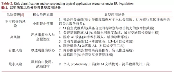 1. 欧盟采取统一且刚性的治理路径,强调以基本权利保护为核心,推行“基于风险”的合规导向模式。其将AI系统按风险等级分类管理,并对高风险应用设定严格义务(具体分类与应用场景参见表2)。