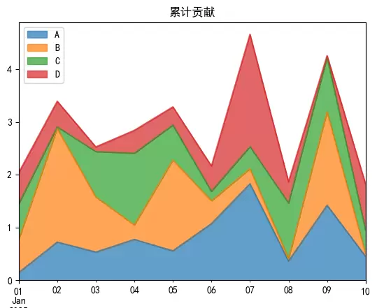 df = df.abs() df.plot(kind='area', stacked=True, alpha=0.7, title='累计贡献') plt.show()