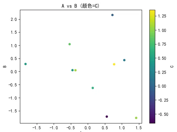 df.plot( kind='scatter', x='A', y='B', c='C', # 颜色映射第三列 colormap='viridis', title='A vs B (颜色=C)' ) plt.show()