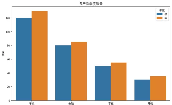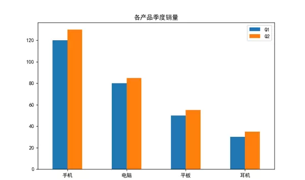 柱状图适用于分类数据的对比。以下示例展示不同产品在两个季度的销量对比。