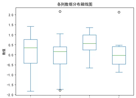 箱线图能够清晰展示各列数据的四分位数、中位数及潜在的离群点。适用于检测异常值和理解数据的离散程度。