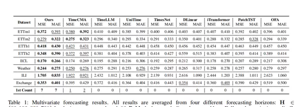 为验证模型性能,研究在8个广泛使用的多变量时间序列数据集上进行了评估:ETTh1、ETTh2、ETTm1、ETTm2、ECL、Weather、ILI 和 Exchange。这些数据涵盖电力负荷、气象变化、金融市场以及医疗健康等多个实际领域。采用均方误差(MSE)和平均绝对误差(MAE)作为主要评价指标,数值越低代表性能越好。