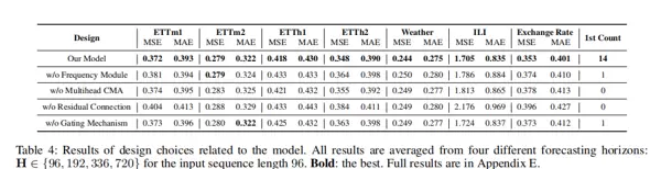 - 移除残差连接 (w/o Residual Connection):导致最严重的性能退步,平均 MSE 上升达 8.36%,表明保持原始时频通道信息对于维持表征完整性至关重要。
