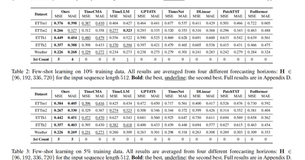 为进一步检验模型在有限数据下的泛化能力,研究设置了仅使用 10% 和 5% 训练样本的小样本学习场景。从表2和表3的结果可见,即便在极端稀疏的数据条件下,T3Time 仍显著优于其他对比方法。例如,在仅使用 5% 数据的情况下,其 MSE 和 MAE 分别比次优模型平均降低了 4.13% 和 1.91%。这表明,借助大语言模型提供的语义先验知识,T3Time 能有效缓解因训练数据不足带来的性能退化问题,具备出色的少样本学习能力。
