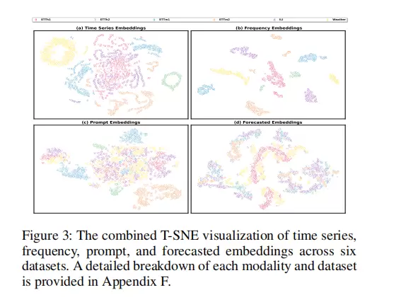 初始的时间域和频率域嵌入(图3a, 3b)分布较为分散;而由 LLM 编码生成的提示嵌入(图3c)呈现出明显的簇状结构,反映出语义信息具备较强的类别区分能力。最重要的是,最终的预测嵌入(图3d)展现出更加紧凑和平滑的聚类形态,且结构上与时间嵌入相似但更为清晰。这直观地说明 T3Time 成功实现了多模态信息的深度融合,构建出一个高质量、结构化的特征空间。