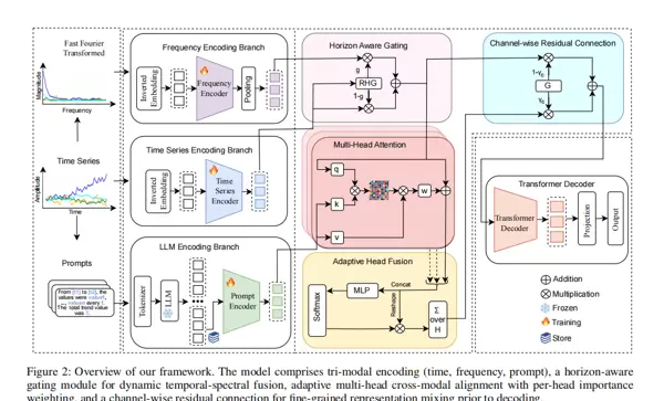 - 设计了一个新颖的三模态预测架构,引入自适应多头交叉模态对齐机制,能够动态协调时间、频域与语义信息之间的关系。