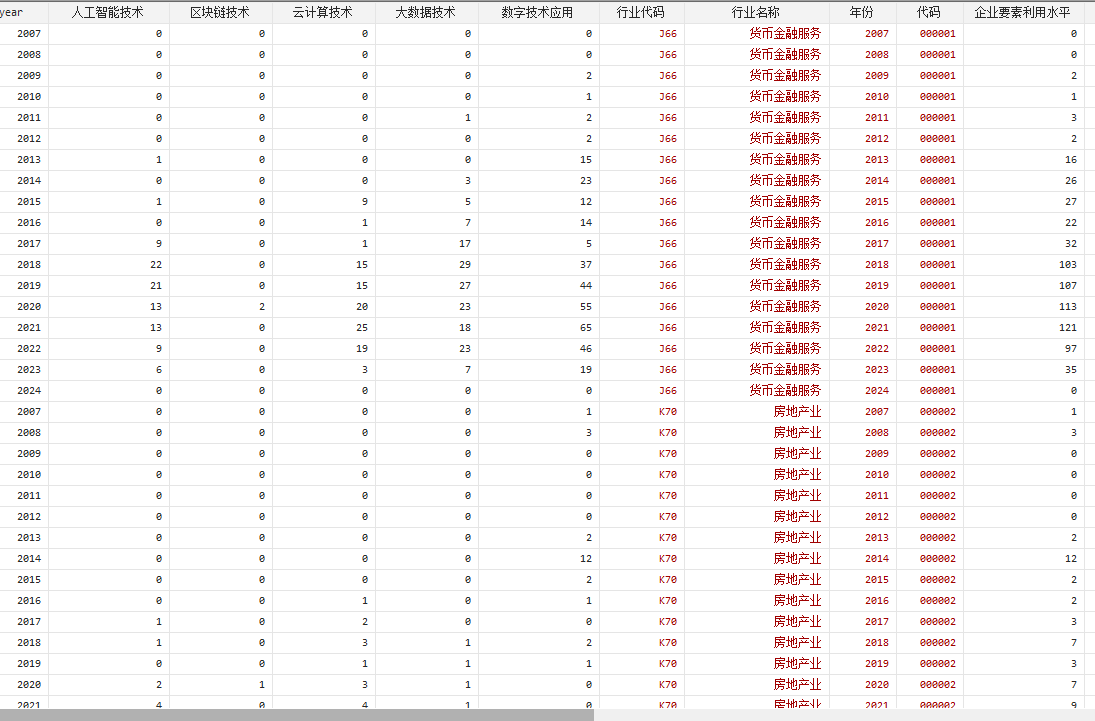 数据说明:送sata代码的A股上市公司企业数据要素利用水平数据【2007 - 2024年】,相关指标如下:
