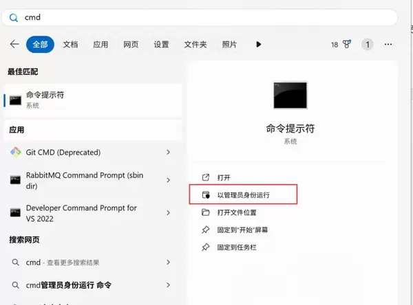 以管理员权限打开终端:点击“开始”菜单,搜索“cmd”,右键选择“以管理员身份运行”。