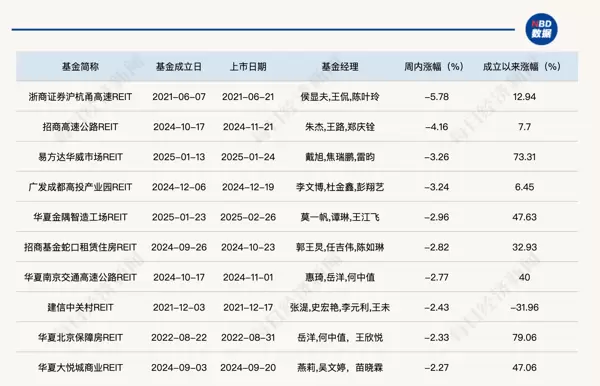 而下跌产品中,高速公路类REITs压力显著。跌幅最大的三只产品依次为浙商证券沪杭甬高速REIT、招商高速公路REIT和易方达华威市场REIT,周内跌幅分别达到5.78%、4.16%和3.26%。