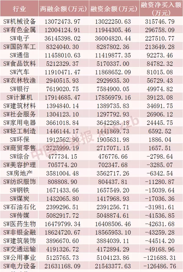 从行业维度观察,申万一级31个行业中,有16个行业的融资余额实现增长。其中,机械设备、有色金属和电子行业位居净买入前三,净买入额分别为31.57亿元、29.68亿元和22.75亿元。而在融资余额下降的15个行业中,基础化工、电力设备和公用事业行业净卖出规模居前,分别被净卖出16.78亿元、12.65亿元和12.17亿元。