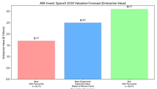 在该模型框架下,ARK提出了三种不同的估值情景:在基础情景中,SpaceX到2030年的估值为2.5万亿美元;悲观情景下估值约为1.7万亿美元;而在乐观情景中,这一数字可攀升至3.1万亿美元。