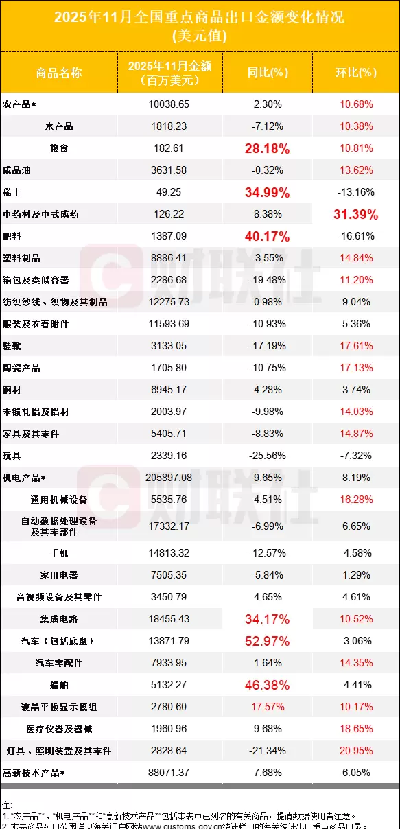 以美元计价,多数重点出口品类在11月实现环比显著增长,中药材、农产品、集成电路以及汽车零部件等均录得两位数以上的环比增幅,仅个别品类出现小幅回落。