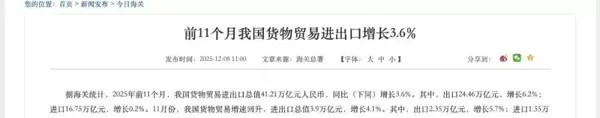 2025年前11个月,我国货物贸易进出口总值达到41.21万亿元,同比增长3.6%。其中,出口总额为24.46万亿元,增长6.2%;进口为16.75万亿元,小幅上升0.2%。