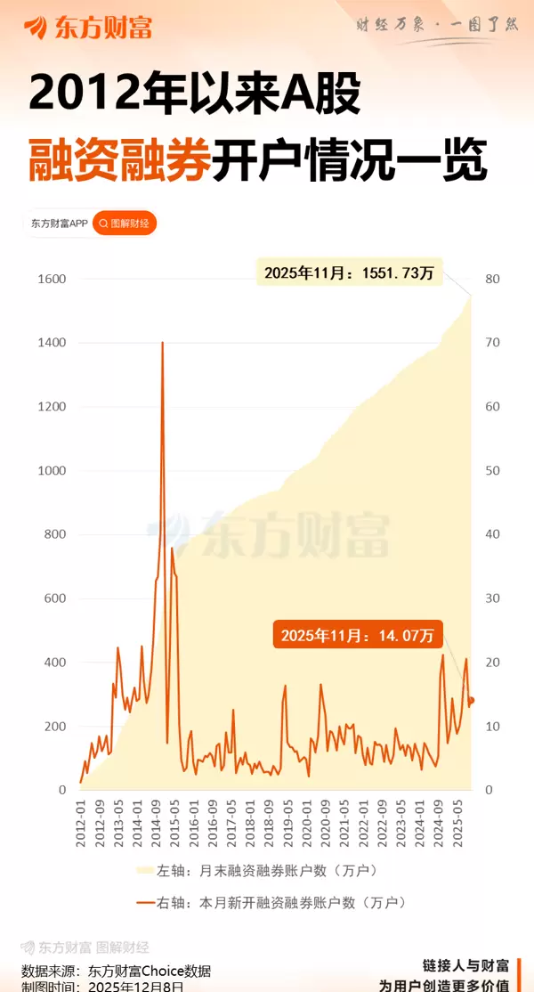 其二,融资融券开户数据持续回暖。根据中证数据有限责任公司发布的最新统计,2025年11月全市场新开两融账户达14.07万户,较10月的13.02万户环比增长8%。截至当月底,两融账户总数已攀升至1551.73万户,市场参与规模稳步扩张。