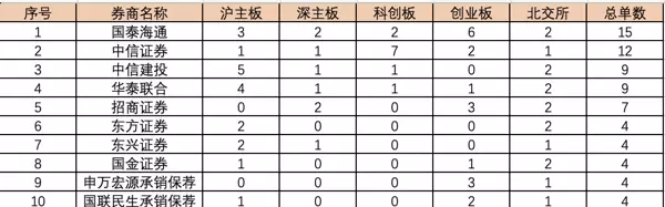 根据界面新闻统计,年内完成上市项目数量居前的十家券商分别为:国泰海通(601211.SH)、中信证券(600030.SH)、中信建投(601066.SH)、华泰联合、招商证券(600999.SH)、东方证券(600958.SH)、东兴证券(601198.SH)、国金证券(600109.SH)、申万宏源承销保荐以及国联民生承销保荐。