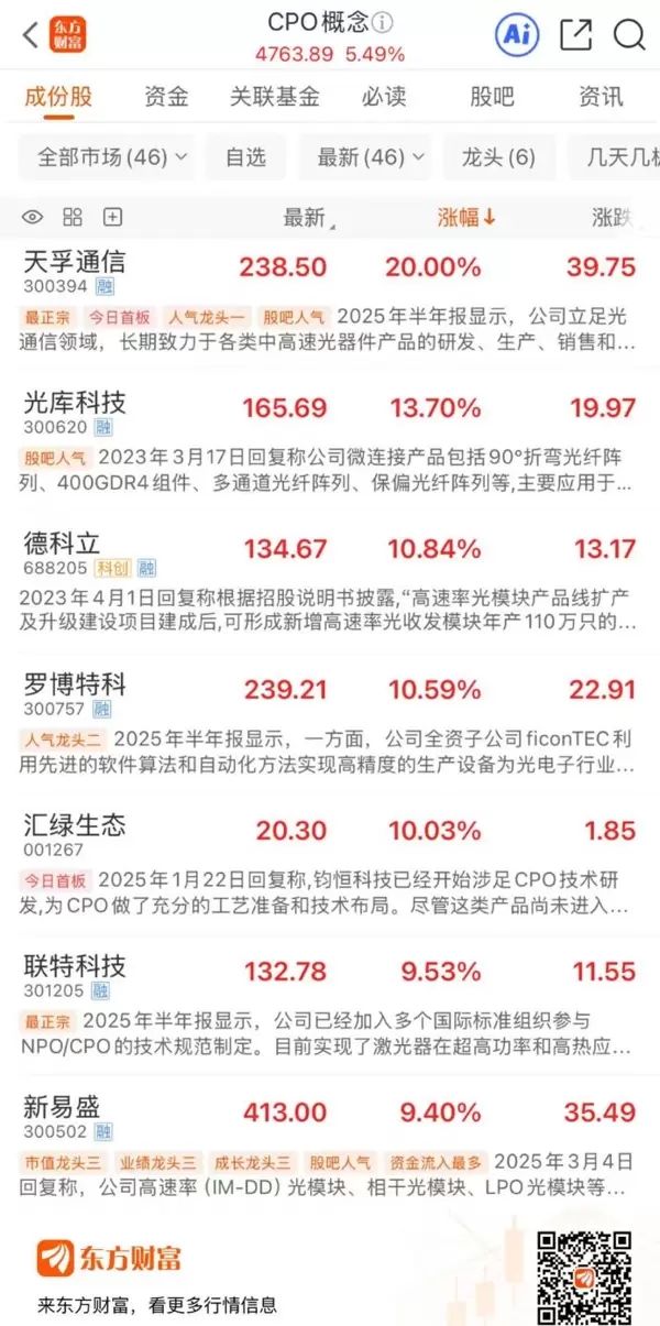 12月8日,CPO概念股迎来集体大涨。截至早盘收盘,该板块以5.49%的涨幅位居两市首位。个股表现同样亮眼,天孚通信实现20CM涨停,光库科技、德科立、罗博特科涨幅均超过10%,汇绿生态封板涨停,联特科技、新易盛、烽火通信、仕佳光子、炬光科技、中际旭创等多只股票涨超8%,另有十余只成分股涨幅超过5%。
