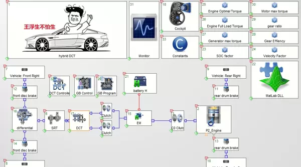 该仿真体系的核心架构由CRUISE和Simulink协同构建而成。其中,整车动力学模型在CRUISE环境中建立,而控制策略部分则完全基于MATLAB/Simulink平台开发。策略模型通过C++编译器转化为dll动态链接库文件,供CRUISE调用,从而实现两个软件间的联合仿真运行。这种集成方式充分发挥了Simulink在控制算法设计方面的优势,以及CRUISE在整车系统级仿真中的高精度特性。