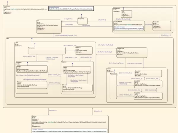 为了提升可读性和理解效率,控制逻辑主要采用Stateflow进行建模。Stateflow作为Simulink的重要组件,提供了图形化的状态机设计环境,特别适合表达复杂模式切换行为。借助其可视化界面,用户可以清晰观察到不同驱动模式(如纯电、混合驱动、再生制动等)之间的转换过程,有助于快速掌握混动系统的运行机制。