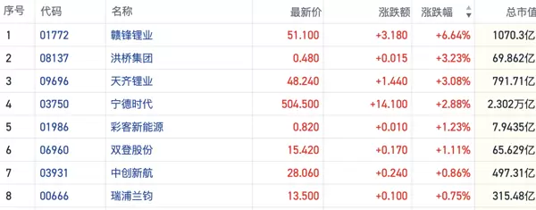 财联社12月8日讯,今日港股市场中锂电与储能概念股再度迎来显著上涨行情。截至发稿时,赣锋锂业(01772.HK)涨幅超过6%,宁德时代(03750.HK)、天齐锂业(09696.HK)等龙头企业也纷纷跟涨,平均涨幅约为3%。