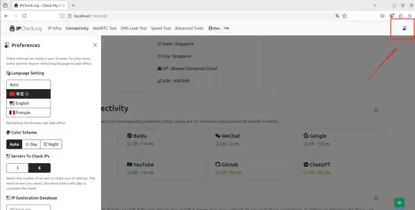 此外,MyIP 支持跟随系统设置自动切换深色与浅色主题模式,并提供中文、英文、法文等多种语言选项,满足不同用户的使用习惯。
