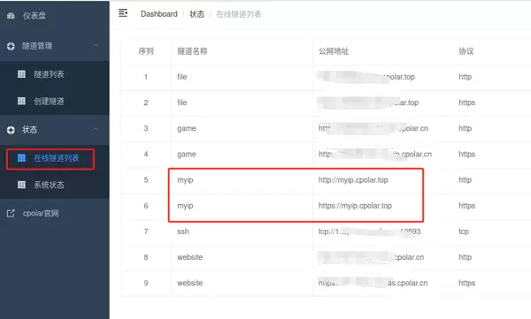 创建成功后,返回左侧“在线隧道列表”,可以看到系统已生成两个公网访问地址。此时可在任意异地设备(如其他电脑或移动终端)的浏览器中输入任一公网地址进行访问。