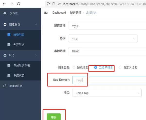 在隧道编辑页面中,将之前保留成功的二级子域名应用到当前隧道配置中: